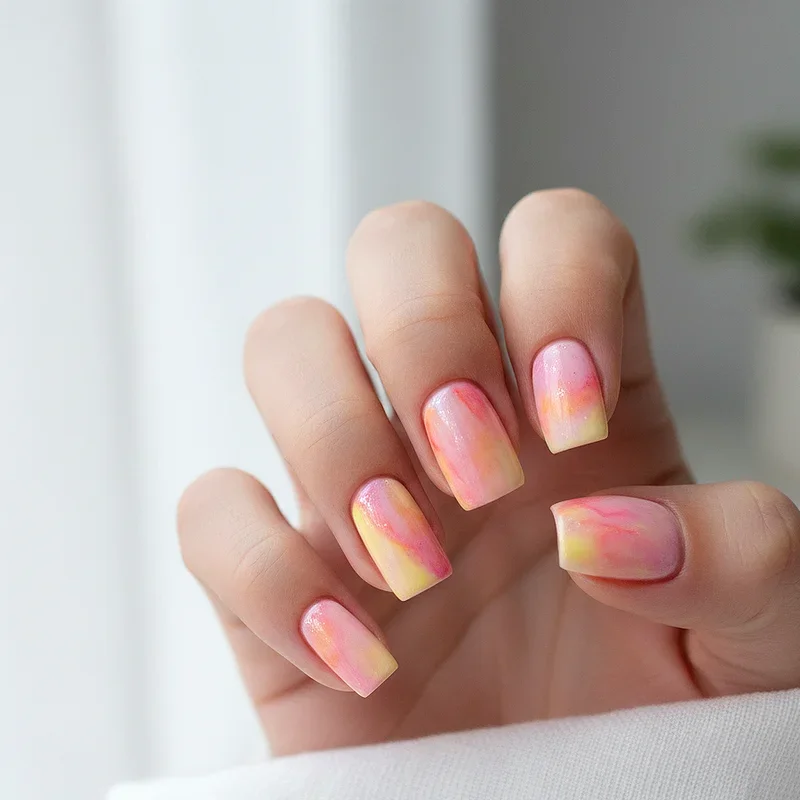 Delicate watercolor techniques transform nails into miniature impressionist paintings using diluted pink and yellow polishes. This ethereal effect mimics the unpredictable beauty of watercolor paintings, where colors blend and bleed organically. Creating this look involves layering translucent washes of color, allowing each layer to partially dry before adding the next. The result appears effortlessly artistic, as if painted by nature itself rather than deliberate design. You can concentrate colors in certain areas while leaving others nearly bare for dynamic visual interest. This technique particularly suits those who prefer subtle nail art that whispers rather than shouts.