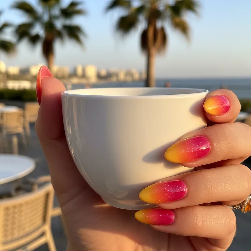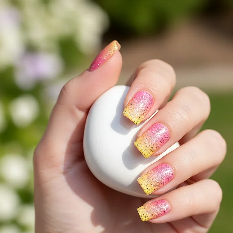 Sparkle meets sunshine when glitter particles dance from pink to yellow across your nails in a dazzling fade effect. Begin with a solid pink base on one end, transitioning through mixed glitter to pure yellow on the opposite end. The glitter acts as a magical bridge between colors, creating depth and dimension that flat polish alone cannot achieve. This design catches light beautifully, making your hands shimmer with every movement throughout the day. You can customize glitter density from subtle shimmer to full disco ball effect based on your personality. This glamorous option perfect for special occasions or whenever you need extra confidence boost.