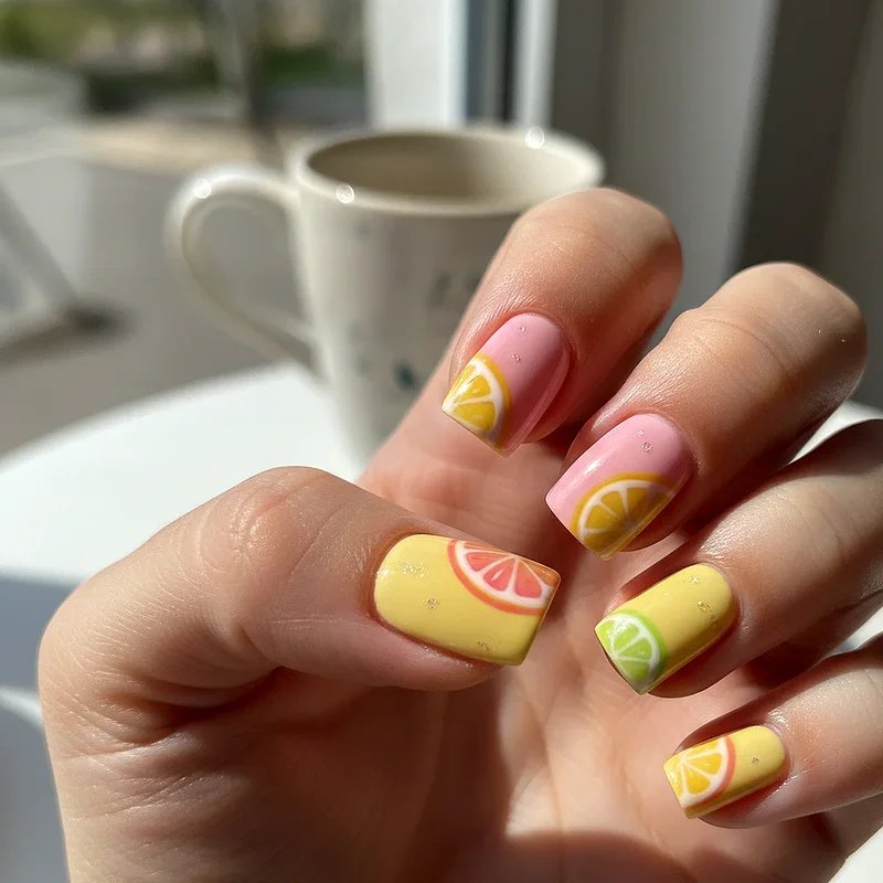 Transform your nails into refreshing citrus slices where pink grapefruit meets sunny lemon in delicious nail art form. Paint semi-circular segments on each nail to mimic fruit cross-sections, complete with tiny white lines representing fruit segments. This playful design brings summer refreshment to your fingertips regardless of the season outside your window. The natural association between yellow and lemons makes this theme instantly recognizable and conversation-starting. You can add tiny seeds or pulp details for extra realism using a fine brush and darker shade accents. This fruity design perfectly complements beach vacations, pool parties, or any time you need a vitamin C boost for your style.