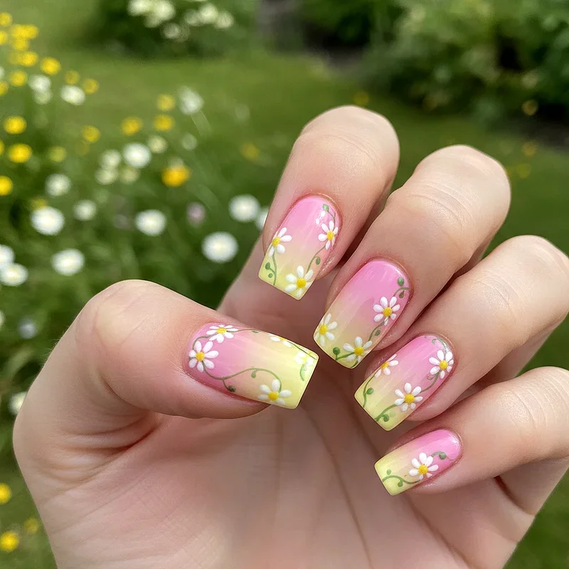 Nothing says spring quite like daisies dancing across your nails in cheerful pink and yellow combinations. Paint your base in soft pink, then use a dotting tool to create yellow centers surrounded by white petals for that classic daisy look. You might wonder if artistic skills are necessary, but simple dots and short strokes create stunning results that anyone can master. Adding tiny green leaves between flowers brings the garden party to life on your nails. This design particularly shines on longer nails where multiple daisies can create a flowing chain effect. The versatility of this pattern allows you to adjust flower sizes based on your nail length and personal preference.