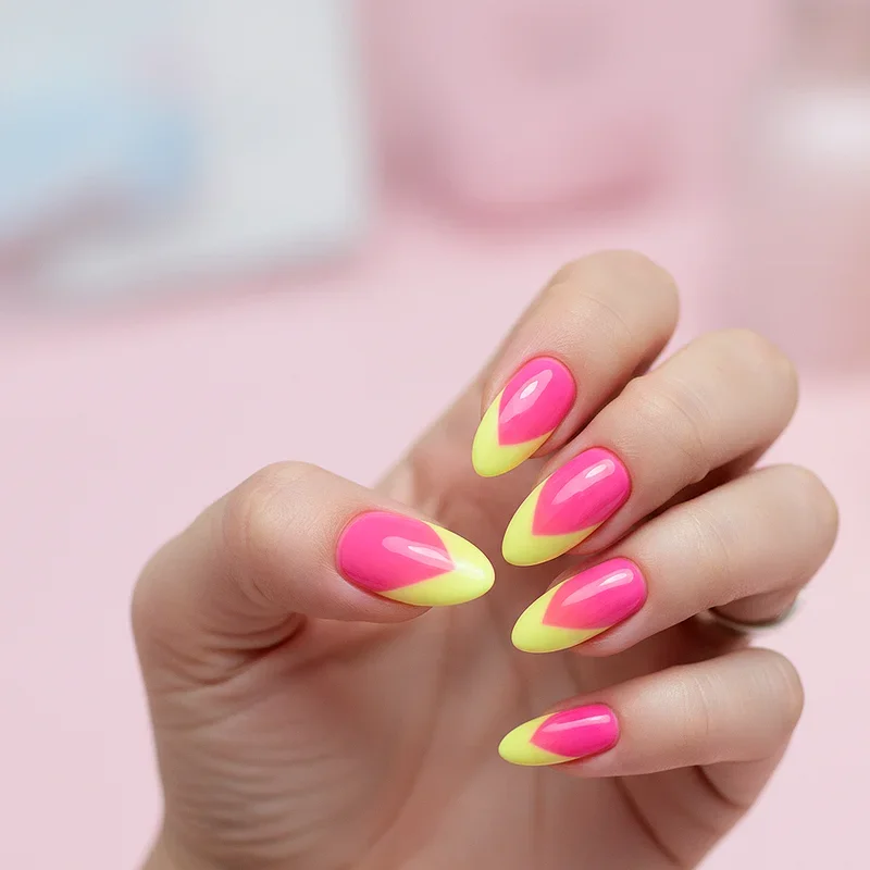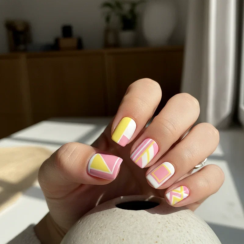 Modern art meets manicure when you embrace geometric color blocking with pink and yellow sections. Clean lines and sharp angles create a sophisticated look that turns nails into tiny architectural masterpieces. Using nail tape ensures precision while dividing each nail into distinct pink and yellow zones with various shapes like triangles, squares, or diagonal splits. The contrast between these warm colors creates visual interest without overwhelming the eye. You can experiment with different geometric patterns on each nail for an eclectic gallery effect. This style particularly appeals to those who love contemporary design and want their nails to reflect a bold, artistic personality.