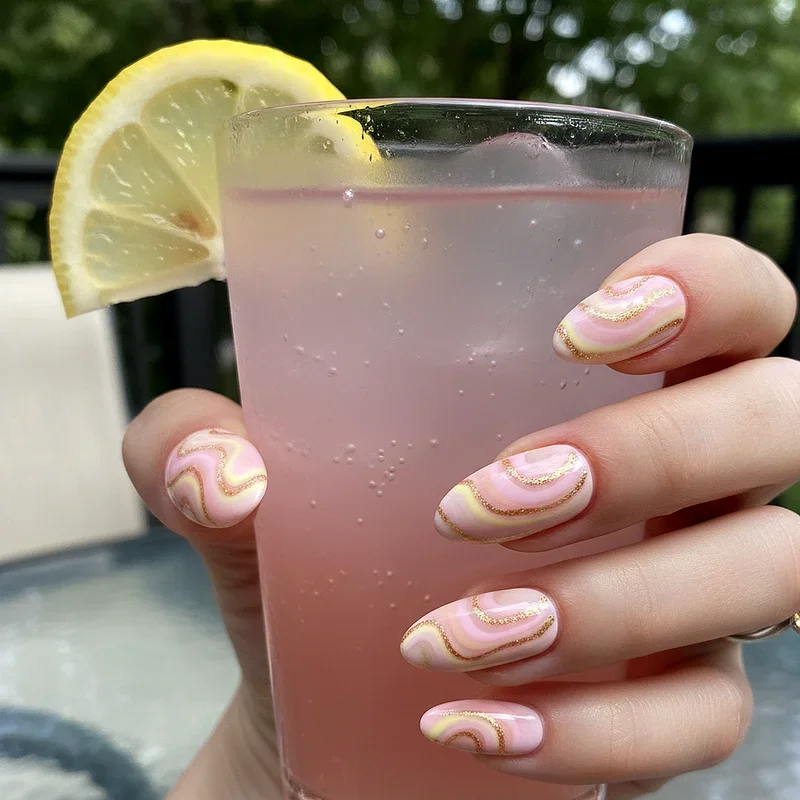Imagine stirring pink lemonade on a hot summer day and capturing that swirling motion on your nails. This design combines soft pink and lemon yellow in mesmerizing spirals that catch everyone's attention. Using a thin nail art brush or toothpick, you create marble-like swirls by dragging colors through each other while wet. The trick involves working quickly before the polish dries and keeping your swirling motions light and deliberate. Some nail artists add tiny bubbles using white dots to enhance the beverage-inspired theme. This refreshing design pairs wonderfully with summer outfits and brings a playful energy to your overall look throughout the warmer months.