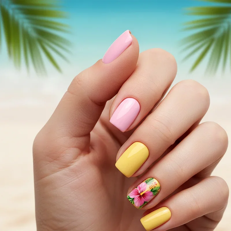 Transport yourself to a Hawaiian paradise with hibiscus flowers blooming across accent nails in vibrant pink and yellow tones. Paint most nails in solid yellow or pink, then dedicate one or two fingers to detailed hibiscus artwork. The flower's natural gradient from yellow center to pink petals creates a perfect opportunity to blend these cheerful colors naturally. Using a fine brush, you can add delicate stamen details and leaf accents for authenticity. This design captures vacation vibes even during mundane weekdays, reminding you of tropical getaways. The combination of solid and decorated nails keeps the overall look balanced while still making a statement about your love for island aesthetics.