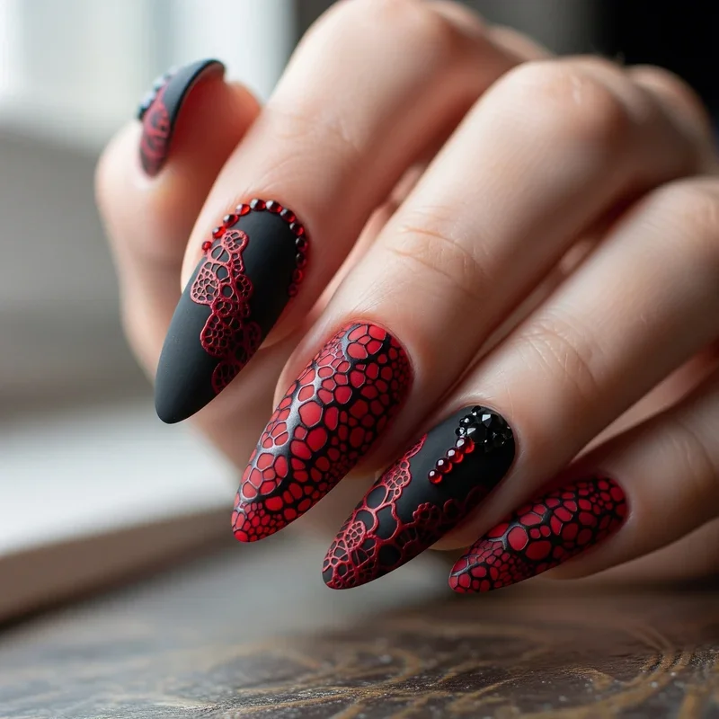 Channel your inner romantic goth with intricate lace patterns that combine the delicate beauty of vintage fashion with the bold contrast of red and black. These designs often feature black lace patterns over a red base, creating an effect that resembles wearing actual lace gloves. You can achieve this look using stamping plates with lace designs or carefully hand paint the patterns using a thin brush. The result is simultaneously elegant and edgy, perfect for special occasions or when you want to add a touch of Victorian drama to your look. This style particularly shines when paired with gothic or vintage fashion choices, making your entire aesthetic cohesive and intentional.
