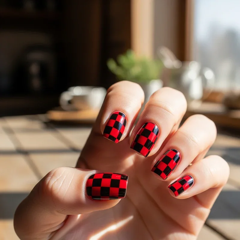 The classic checkerboard pattern gets a dramatic makeover when executed in red and black, creating a bold statement that never goes unnoticed. This retro inspired design can be achieved using tape to create perfect squares or freehand painting for a more organic look. You might cover all nails in the pattern or use it as an accent on one or two fingers while keeping others solid. The size of the checks can vary from tiny micro patterns that create an optical illusion to larger blocks that make a bolder statement. This design particularly resonates with those who love vintage aesthetics or racing inspired fashion.