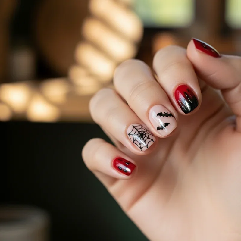 Red and black naturally lend themselves to spooky season, creating Halloween designs that are both festive and wearable. Paint dripping blood effects with red polish over black bases, or create spider webs, bats, and haunted house silhouettes. Gothic crosses, vampiric designs, or witchy symbols work perfectly in this color scheme. These designs can range from subtly spooky with small accent details to full theatrical effects that embrace the Halloween spirit completely. The versatility of red and black means these designs can transition from October festivities to year round wear for those who embrace gothic aesthetics, making them perfect for anyone who loves a touch of darkness.