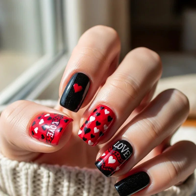 Romance meets edge when red and black combine for Valentine's themed nail art that goes beyond typical pink hearts. Create sophisticated designs featuring black lace hearts on red backgrounds, or red roses with black thorns for a more dramatic take on love. Incorporate cupid's arrows, love letters, or romantic quotes in elegant script. These designs work perfectly for Valentine's Day but are versatile enough for date nights year round. The combination of passionate red with mysterious black creates a mature, sophisticated approach to romantic nail art that appeals to those who prefer their romance with a hint of drama and sophistication.