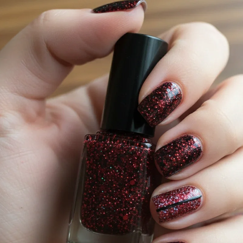 Add some sparkle to your life with glitter accents that make red and black nails truly shine. Incorporate red glitter over black bases or black glitter over red for a glamorous effect that catches light beautifully. You might create an accent nail entirely covered in glitter or add glitter gradients that fade from the tips or cuticles. Fine glitter creates a subtle shimmer perfect for everyday wear, while chunky glitter makes a bold statement for special occasions. The combination of matte or cream finishes with strategic glitter placement creates depth and dimension that transforms simple nail art into something truly special and eye catching.