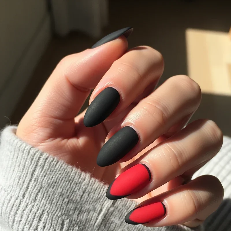 Transform the traditional glossy nail look by incorporating matte finishes that give red and black nails a velvety, sophisticated appearance. Apply a matte top coat over your red and black design, or create contrast by keeping some nails glossy while others remain matte. The textural difference adds visual interest and depth that catches the eye in subtle ways. Matte black nails with glossy red accents create an especially striking contrast that feels both modern and timeless. This finish works particularly well with geometric designs or color blocking, as the matte texture emphasizes clean lines and shapes while giving your manicure an expensive, editorial quality that photographs beautifully.