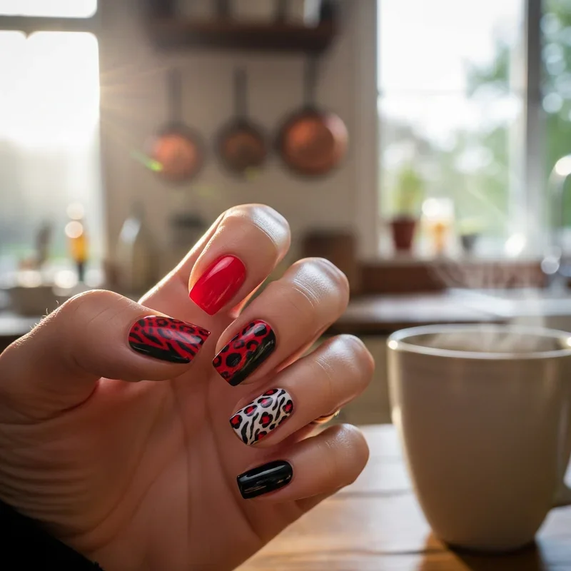 Unleash your wild side with animal print designs that incorporate red and black in unexpected ways. Create leopard spots using black outlines on a red base, or design zebra stripes that alternate between the two colors. Snake skin patterns work beautifully in this color combination, offering a sophisticated take on animal prints. These designs can be as subtle or bold as you prefer, from a single accent nail featuring the print to full coverage on all ten fingers. Animal prints in red and black offer a fierce, confident look that pairs perfectly with both casual and dressy outfits, making you feel powerful and stylish.