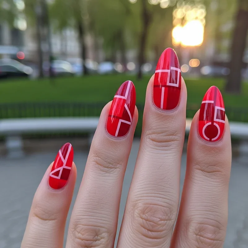 Who says nail art has to be soft and flowy? Geometric red patterns bring a modern, architectural feel to your manicure. Think sharp angles, clean lines, and bold shapes that make a statement. You can create triangular patterns, checkerboard designs, or abstract geometric shapes using red as your primary color. Combining different shades of red adds depth, while incorporating black or white creates striking contrast. The precision required for geometric designs means they often look best when done professionally, but nail striping tape can help achieve clean lines at home. Popular geometric patterns include chevrons, color blocking, and minimalist line work that creates maximum impact with minimal elements. This style particularly appeals to those who love modern art and minimalist design. The structured nature of geometric patterns also tends to be more forgiving as nails grow out, maintaining their intentional appearance longer than free-form designs.