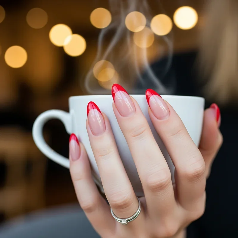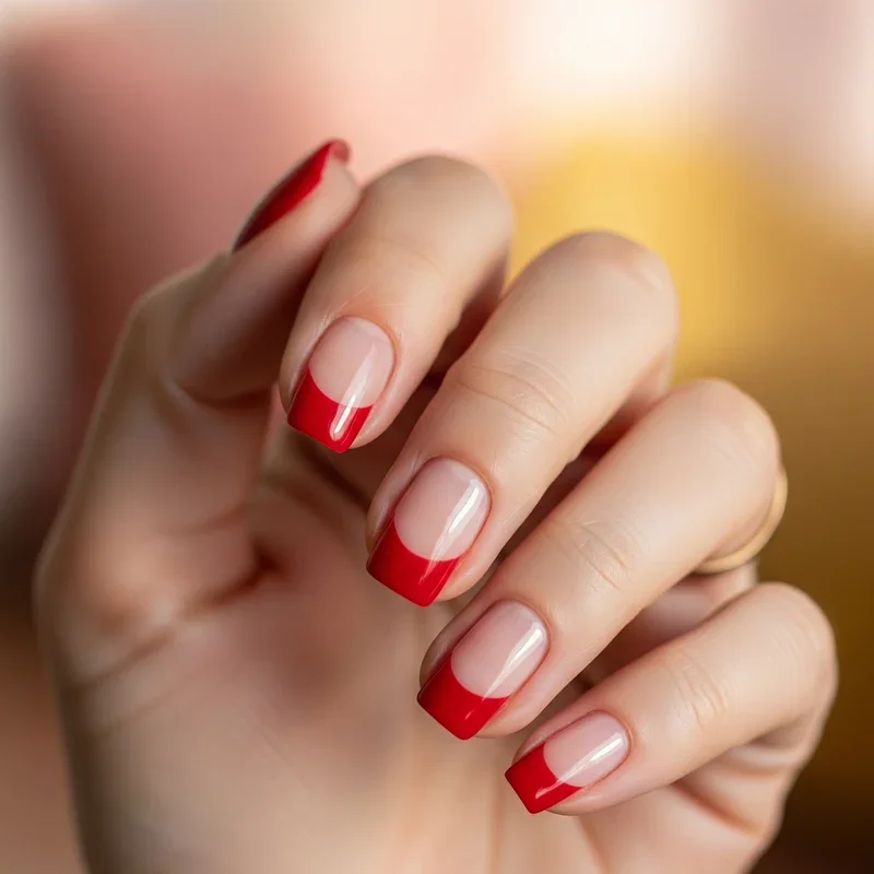 Who says French manicures have to be boring? Give this classic style a modern makeover by swapping white tips for vibrant red ones. This unexpected twist combines the sophistication of a French manicure with the boldness of red polish. You can keep the base nude or clear for a subtle look, or go all out with a pink base for extra femininity. The red tips can be thin and delicate or thick and statement-making, depending on your style. This design works beautifully for both casual brunches and formal events. The contrast between the natural or nude base and the red tips creates a visually striking effect that draws attention to your hands without being overwhelming. Want to take it up a notch? Add a thin gold line where the red meets the base color for an extra touch of glamour that'll have everyone asking where you got your nails done. This modern take on the French manicure proves that classic styles can evolve while maintaining their elegant essence.