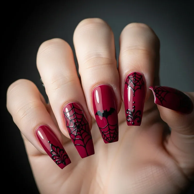 For those who like their beauty with an edge, crimson and black gothic nails deliver drama in spades. This bold combination channels vampire vibes and gothic romance, perfect for making a statement. You can alternate crimson and black nails, create ombré effects between the two colors, or use black for intricate lace-like designs over a crimson base. Adding elements like tiny studs, chains, or metallic accents enhances the gothic aesthetic. Popular gothic nail art includes spider webs, roses with thorns, baroque patterns, or even tiny bats for a playful touch. The contrast between deep crimson and black creates a mysterious, alluring effect that's both elegant and edgy. This style particularly suits stiletto or coffin-shaped nails, though it can work with any shape. While some might consider this look too bold for everyday wear, gothic nail art has become increasingly mainstream, especially among those who appreciate alternative fashion and want to express their darker aesthetic.