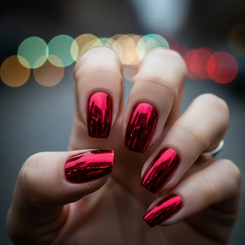 If you thought regular glossy red nails were eye-catching, wait until you try red chrome! This futuristic finish creates a mirror-like effect that's absolutely mesmerizing. Chrome powder applied over red polish transforms your nails into tiny reflective surfaces that catch and bounce light from every angle. The result looks almost liquid, like molten metal on your fingertips. The process involves applying a special base, curing it under UV light, then rubbing chrome powder onto the tacky surface to create that incredible mirror finish. While chrome nails require a bit more maintenance and professional application, the wow factor makes it worthwhile for special occasions. You can choose from various red chrome shades, from rose gold-red hybrids to deep crimson metallics. The finish is so reflective that you can literally check your makeup in your nails! Fair warning: you might find yourself constantly checking out your reflection in your nails because they're just that stunning.