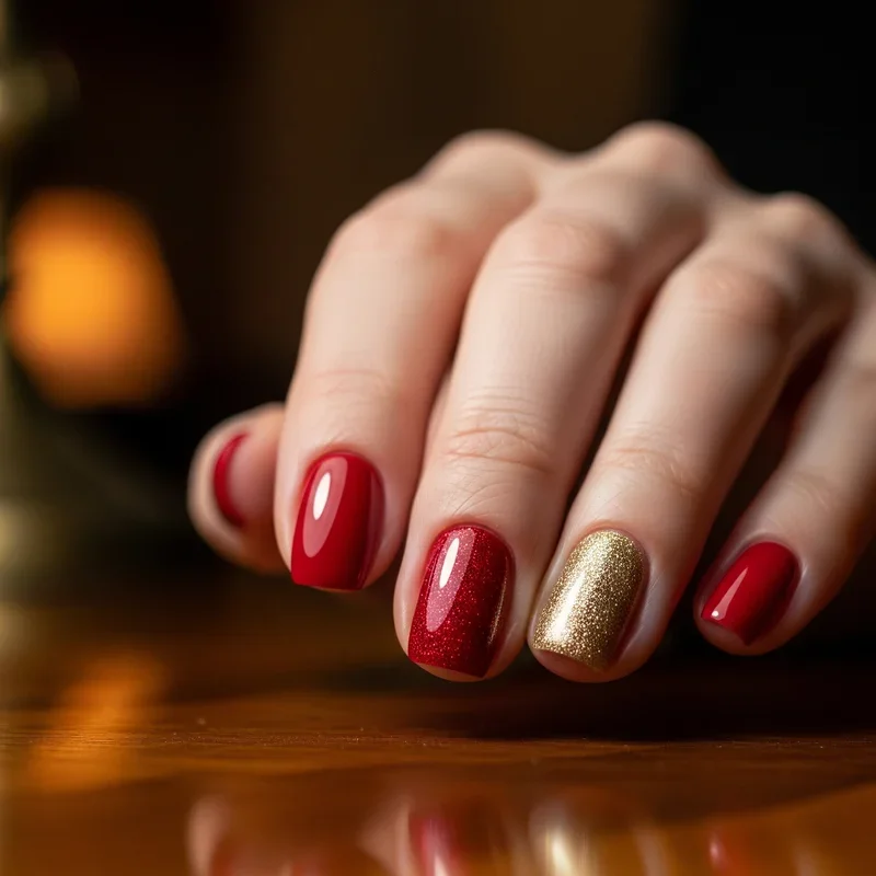Want to feel like royalty? Combine red polish with gold glitter for a manicure fit for a queen. This luxurious combination works year-round but especially shines during the holiday season. You can go subtle with just gold glitter accent nails against a red base, or go bold with gold glitter tips on every finger. Another gorgeous option involves creating a glitter gradient, starting heavy at the tips and fading toward the cuticle. The warm tones of gold complement every shade of red beautifully, from orange-based corals to blue-based burgundies. This combination has been a favorite among celebrities on red carpets, and it's easy to see why. The sparkle catches light from every angle, creating a dazzling effect that's impossible to ignore. This combo particularly suits special occasions like weddings, galas, or any event where you want your nails to catch the light and turn heads. Trust me, you'll find yourself admiring your hands all day with this glamorous combination.