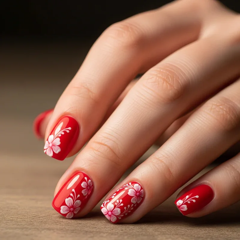 Transform your nails into a blooming garden with delicate red floral designs. Whether you prefer realistic roses or abstract flower shapes, red floral nail art adds a romantic touch to any manicure. You can keep it simple with small flowers on accent nails or go all out with intricate botanical designs across all ten fingers. White or nude backgrounds make red flowers pop, while black backgrounds create a more dramatic, vintage-inspired look. The beauty of floral nail art lies in its versatility because you can adapt it to any season. Spring calls for cherry blossoms, summer loves bold poppies, fall embraces deep red dahlias, and winter welcomes poinsettias. Techniques range from hand-painting with thin brushes to using stamps or decals for more uniform designs. Some artists even incorporate 3D elements like tiny rhinestone centers or raised petals for added dimension. This style particularly suits those who love feminine touches and want their nails to tell a story.