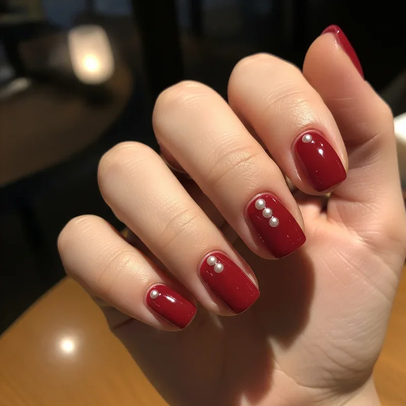 Combine the richness of ruby red polish with the elegance of pearl accents for a manicure that screams luxury. This combination creates a beautiful contrast between the bold color and delicate embellishments. You can place small pearl studs along the cuticle line, create patterns with different sized pearls, or use just one statement pearl on accent nails. The key to making this look work involves balancing the pearls with the red polish so neither element overwhelms the other. This style works beautifully for special occasions like weddings or formal events where you want your nails to complement elegant jewelry. The pearls catch light differently than glitter, creating a more sophisticated shimmer. Application typically involves using nail glue or embedding pearls in wet polish or gel before curing. Some designs incorporate pearl powder for a subtle pearlescent finish combined with actual pearl embellishments. The result is a manicure that looks like it belongs on royalty.