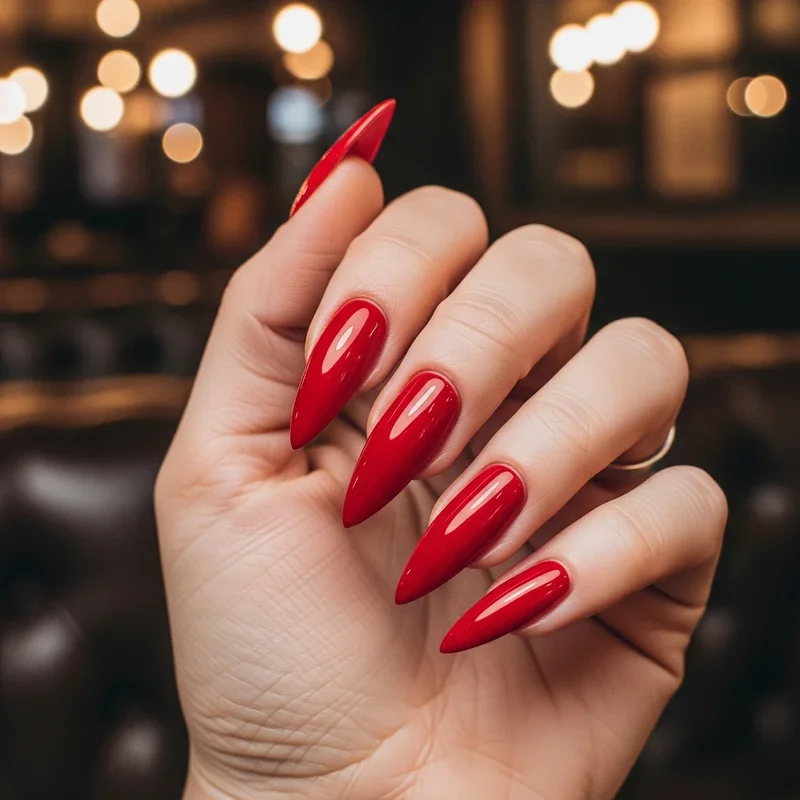 When you want nails that command attention, red stiletto nails deliver maximum impact. These sharply pointed nails painted in vibrant red create a look that's equal parts fierce and fabulous. The dramatic shape alone makes a statement, but adding red polish takes it to another level entirely. Whether you choose classic glossy red, matte finish, or embellishments like rhinestones, stiletto nails ensure all eyes stay on your hands. The length and shape create an elegant, elongating effect on fingers, making hands appear more graceful and dramatic. Popular embellishments for red stilettos include Swarovski crystals along the sides, gold foil accents, or intricate nail art that takes advantage of the extra nail real estate. This shape requires commitment since daily tasks become slightly more challenging, but the confidence boost makes it worthwhile. Red stilettos particularly suit those who love making bold fashion choices and aren't afraid to stand out. Just be prepared for compliments and questions about how you manage everyday tasks!