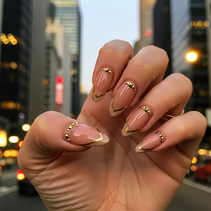 Elevate your natural look with the perfect marriage of nude polish and gold accents! This sophisticated combination works for literally any occasion, from board meetings to beach weddings. Apply your favorite nude shade as a base – choosing one that complements your skin tone – then add gold details using striping tape, stickers, or freehand designs. A single gold stripe down the center, golden tips, or small gold dots can transform a simple nude manicure into something special. Try creating golden chevrons at the base or tips for a modern twist on this classic combo. The contrast between the understated base and metallic accent creates an expensive-looking manicure that whispers rather than shouts. This design is perfect for those who want their nails to enhance rather than dominate their overall look. It's like wearing delicate gold jewelry on your fingertips – subtle, elegant, and always appropriate for any dress code or occasion.