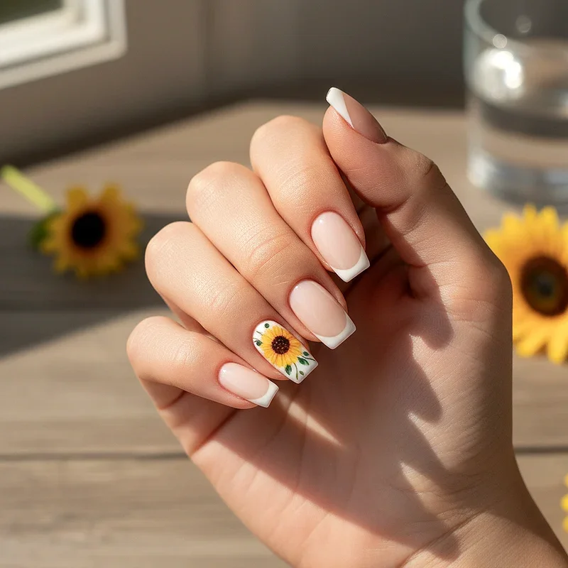 2. French Tips with Tiny Sunflowers
