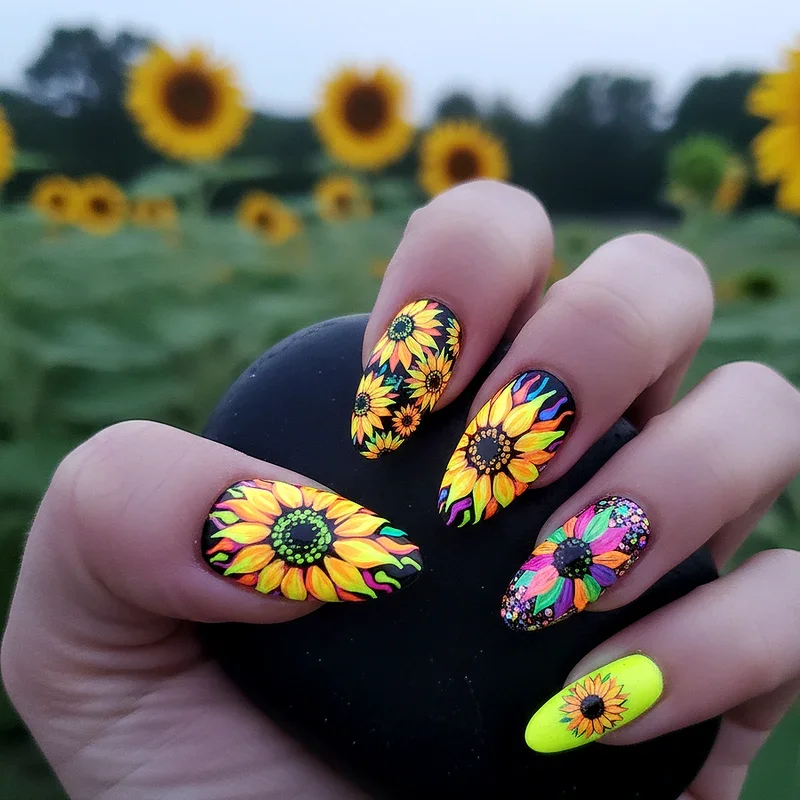 Turn up the volume on traditional sunflower designs with electric neon colors that glow with intensity and demand attention wherever you go. This fearless approach reimagines sunflowers in fluorescent yellows, hot pinks, and electric oranges that practically vibrate with energy. The neon treatment transforms these familiar flowers into something futuristic and fashion-forward, perfect for music festivals, night clubs, or anyone who refuses to blend into the background. You can enhance the effect with glow-in-the-dark topcoats or UV-reactive polishes that literally light up under blacklight. The key to rocking neon sunflowers lies in confidence and committing fully to the bold color choices without trying to tone them down. This design proves that sunflowers don't always have to be sweet and subtle; sometimes they can be loud, proud, and unapologetically attention-grabbing statement pieces.