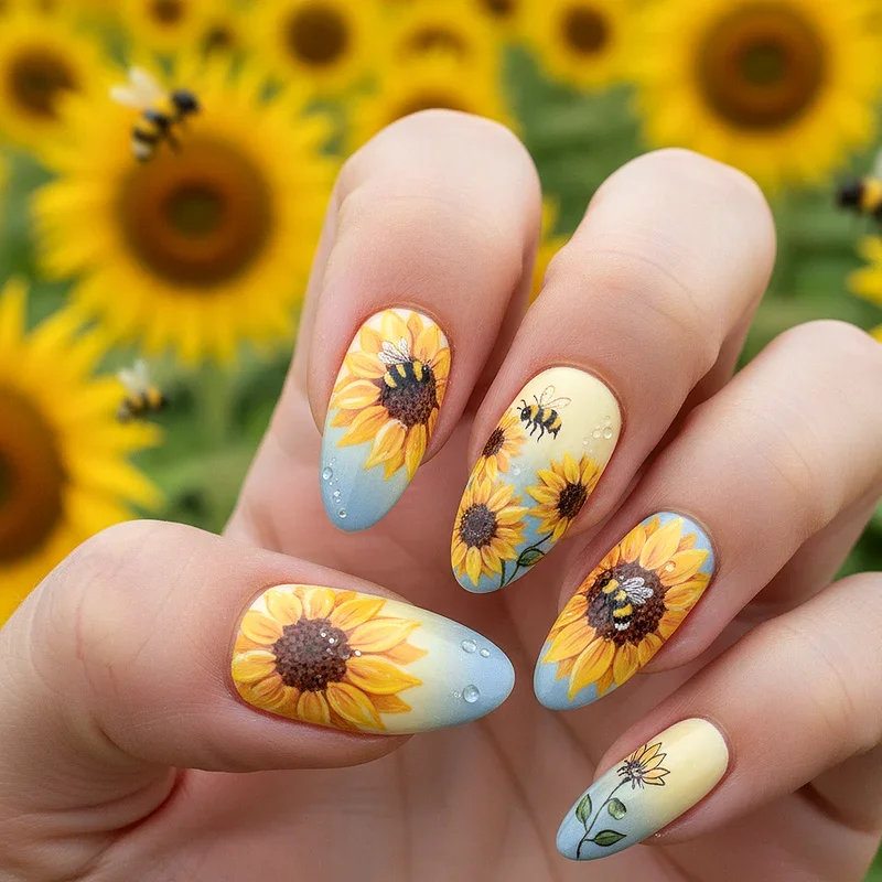 Bring your nail art to life with an adorable ecosystem featuring cheerful sunflowers visited by tiny, buzzing bees that add movement and storytelling to your manicure. This playful design celebrates the natural relationship between these flowers and their pollinators, creating a miniature nature scene on your fingertips. The bees can be painted in various positions, some landing on petals while others hover nearby, adding dynamic energy to the static flowers. You can make the bees as realistic or cartoonish as you prefer, with some people opting for cute, smiling bees with exaggerated features. This design works particularly well when you dedicate different elements to different nails, perhaps having sunflowers on most fingers with one or two featuring the star bee visitors. The combination appeals to nature lovers and anyone who appreciates nail art that tells a story beyond simple decoration.