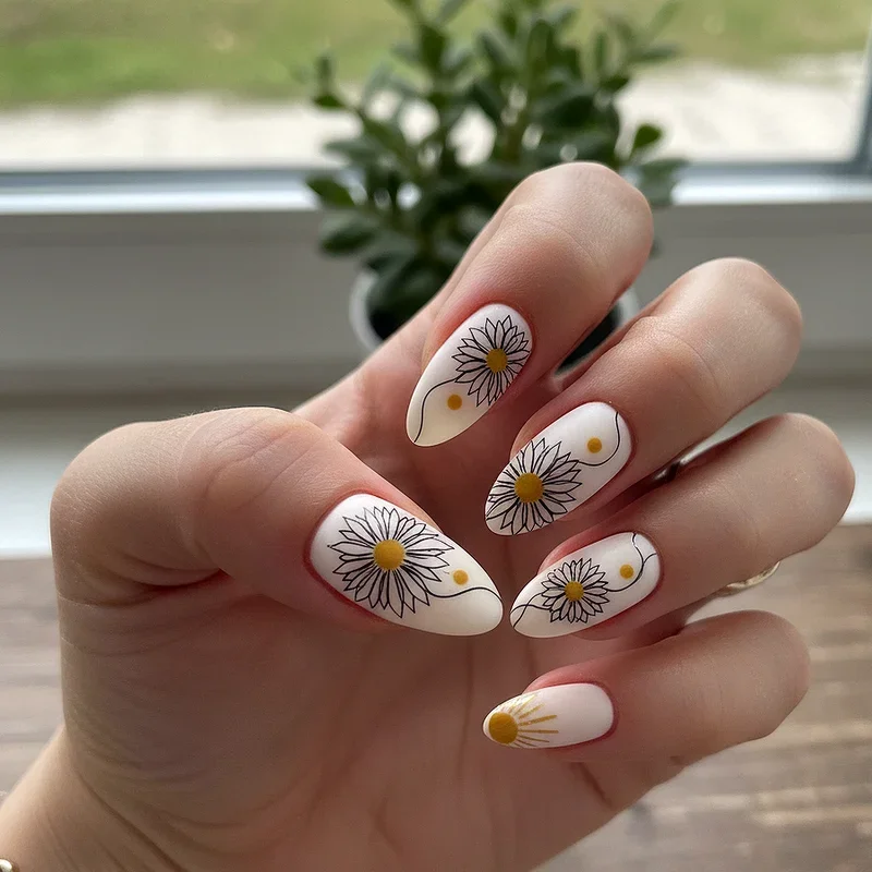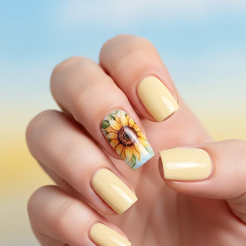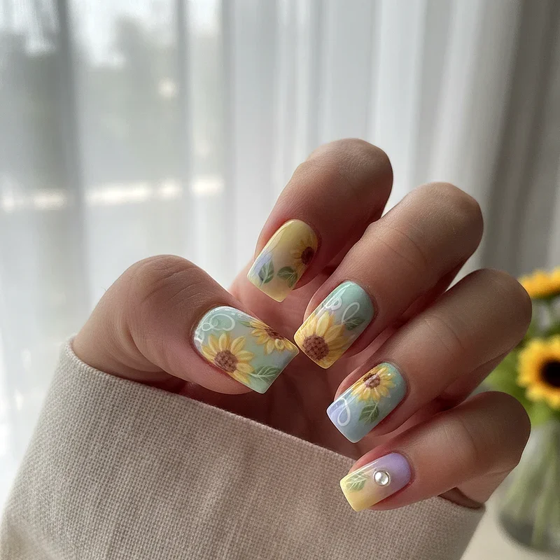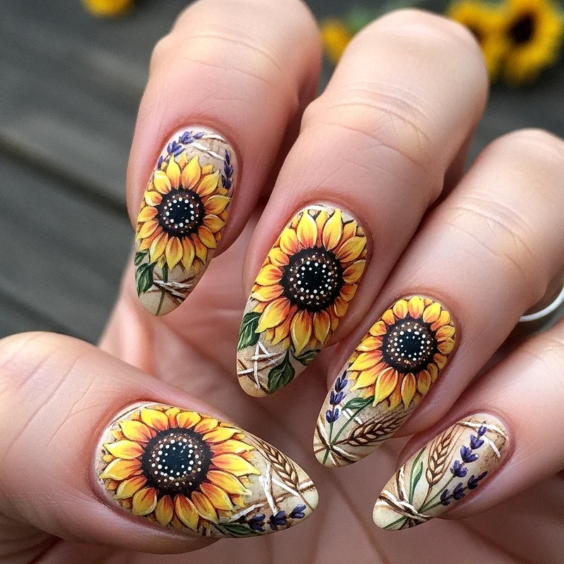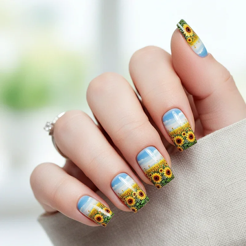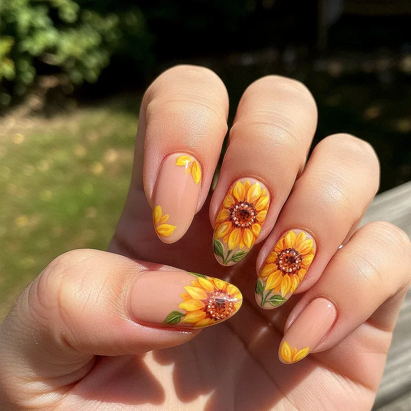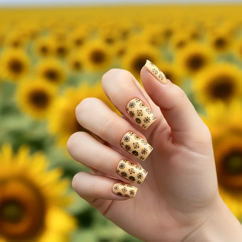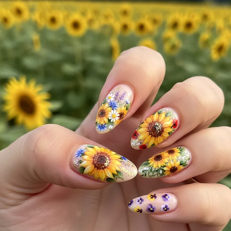 Why limit yourself to just sunflowers when you can create a diverse botanical garden featuring sunflowers as the stars alongside supporting cast of daisies, roses, and wildflowers? This abundant design celebrates floral diversity while maintaining sunflowers as the focal point through size, placement, or color intensity. The mixed approach allows for more creative freedom and prevents the design from feeling repetitive across all ten nails. You can assign different flowers to different fingers or create a meadow effect where various blooms intertwine naturally. The key to success lies in maintaining color harmony, perhaps using a consistent color palette that ties all the different flowers together cohesively. This design particularly appeals to those who love variety and want their nails to reflect the beautiful chaos of a wildflower field in full bloom.