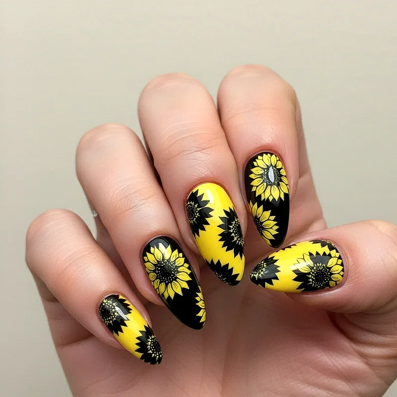Make a bold statement with the dramatic combination of jet black backgrounds and vibrant yellow sunflowers that create an eye-catching contrast impossible to ignore. This high-impact design plays with the natural color scheme of sunflowers while adding an edgy twist that sets it apart from traditional floral nail art. The black base makes the yellow petals appear even more luminous, creating an almost three-dimensional effect that draws the eye. This striking combination works beautifully for those who love to blend feminine florals with a touch of gothic glamour. You can enhance the design by adding white highlights to the petals or incorporating metallic gold accents for extra dimension. The versatility of this color scheme means it transitions seamlessly from day to night, making it perfect for busy individuals who need their nails to work as hard as they do.