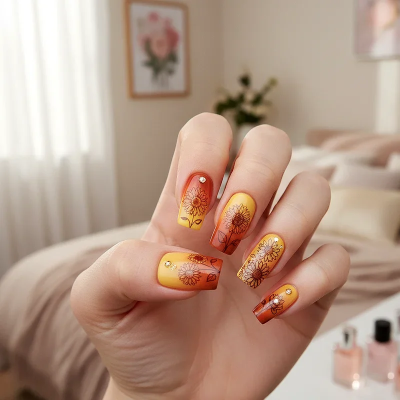 Create a stunning sunset effect with ombre backgrounds that transition from deep orange to soft yellow, adorned with bold sunflower silhouettes that stand out against the gradient sky. This design captures the magic of golden hour when sunflowers are backlit by the setting sun, creating dramatic shadows and warm atmospheric colors. The ombre technique adds depth and sophistication to your nails while the silhouettes keep the design from becoming too busy or overwhelming. You can experiment with different color combinations, from traditional sunset hues to unexpected gradients like purple to pink or blue to green. The silhouettes can be painted in solid black for maximum contrast or in deep brown for a softer effect. This versatile design works equally well for romantic date nights or casual brunches with friends, offering a perfect balance between artistic complexity and wearable style.
