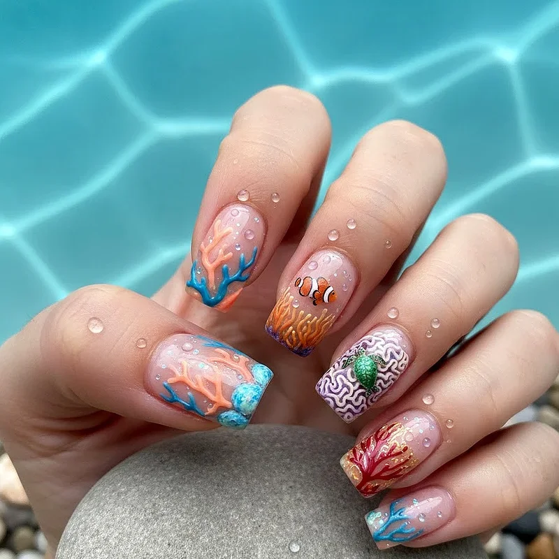Dive beneath the waves with coral reef designs that showcase the ocean's hidden treasures in vibrant detail. Paint colorful corals in pinks, purples, and oranges against deep blue backgrounds, adding small fish or sea turtle silhouettes for movement. This underwater theme allows for incredible creativity as you recreate the diverse ecosystem thriving below tropical waters. Use dotting tools to create coral polyps and sea anemones, building texture and dimension through layered details. You can add shimmer or holographic topcoats to mimic water's refractive qualities and light filtering through ocean depths. This design works beautifully for scuba enthusiasts and ocean lovers who want to carry underwater beauty with them always. The coral reef represents nature's incredible biodiversity and reminds us of precious ecosystems we must protect for future generations to enjoy and appreciate.