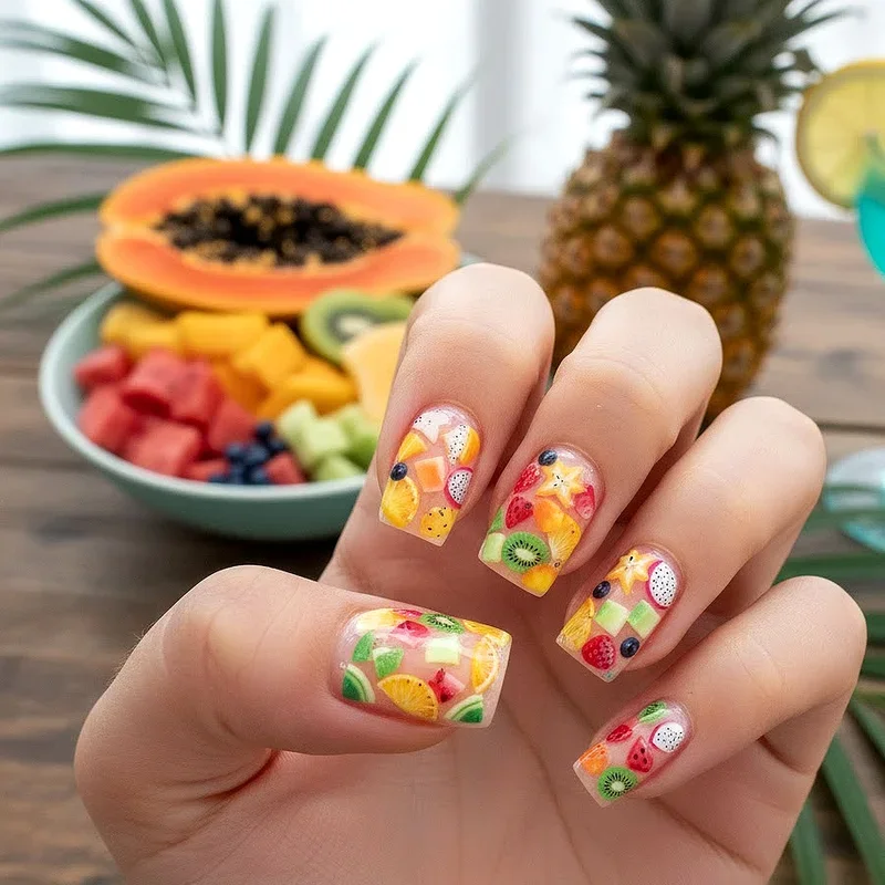 Why choose one fruit when you can celebrate the entire tropical produce section on your nails? This fun design incorporates multiple fruits like watermelons, oranges, kiwis, and strawberries across different nails for maximum visual impact. Each nail becomes its own miniature fruit portrait, creating a cohesive yet varied look that sparks joy and conversation. The bright colors naturally complement each other, making coordination effortless despite the variety of designs involved. You can paint fruit slices showing their juicy interiors or whole fruits with stems and leaves for different effects. This playful approach to nail art celebrates summer's bounty and reminds us of refreshing fruit salads enjoyed on hot afternoons. The design works particularly well for festivals, farmers markets, or any casual summer gathering where fun takes priority over formality.
