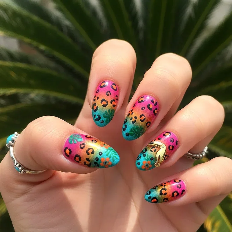 Combine animal print edge with tropical color palettes for bold nails that make fearless fashion statements. Replace traditional leopard browns with hot pinks, turquoise blues, and lime greens for unexpected tropical twist on classic patterns. This fusion design appeals to those who love both wild style and beachy vibes, refusing to choose between different aesthetic preferences. The leopard spots add texture and movement while tropical colors keep the overall look summery and vacation appropriate. You can paint full leopard nails or use the print as accent elements combined with solid tropical colors for varied intensity. This design radiates confidence and personality, perfect for those who approach summer style with adventurous spirit and creative vision. The unexpected color combination challenges traditional nail art rules while creating something fresh, modern, and utterly unforgettable that commands attention wherever you go.