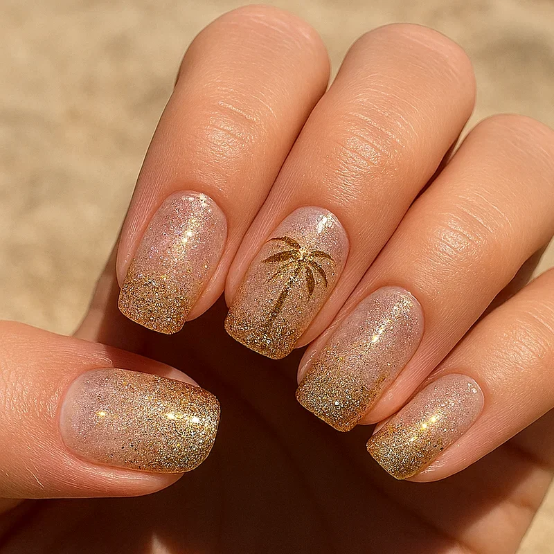 End your tropical nail journey with glamorous shimmer that captures sunlight dancing on ocean waves and sandy beaches. Layer gold, bronze, and iridescent glitters over tropical base colors to create dimension and sparkle that catches every ray of light. This luxurious approach elevates basic tropical themes into something special and celebration worthy for formal summer events. You can create full glitter nails, glitter gradients, or strategic glitter accents depending on your desired level of drama and sparkle. The metallic elements add warmth and richness while maintaining clear connections to tropical beaches where golden hour transforms everything it touches. This design proves tropical nail art can be both playful and elegant, fun and sophisticated, casual and dressy depending on execution. The shimmer reminds us that summer itself is magical, filled with golden moments that sparkle in our memories long after the season ends.