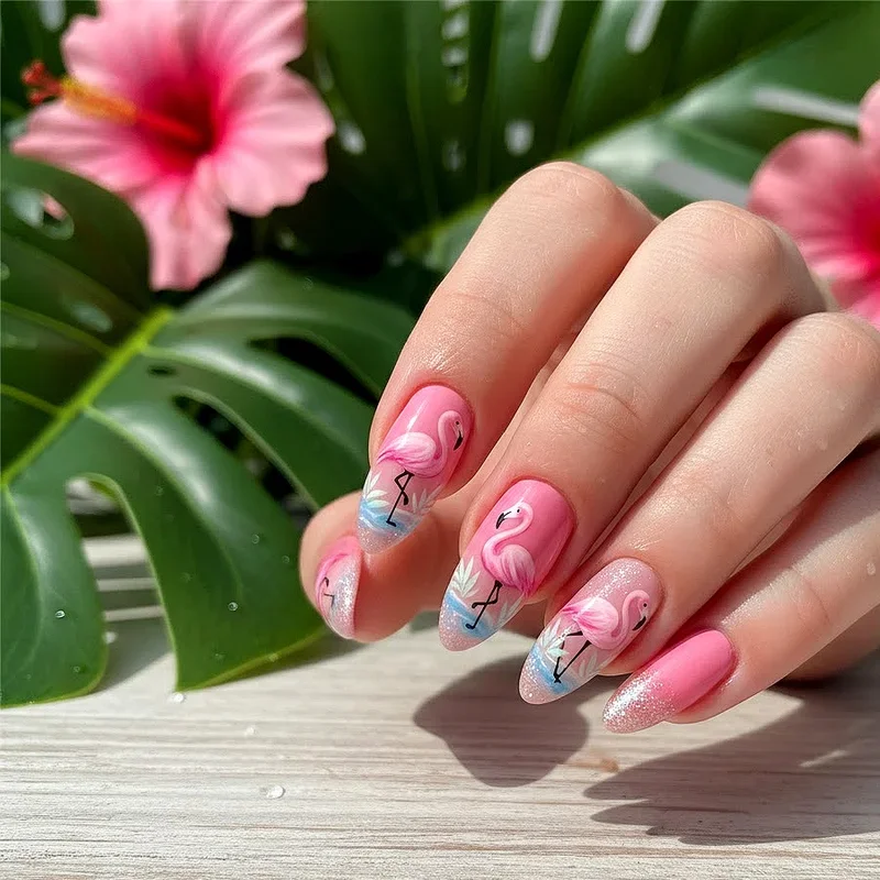 Flamingos have become iconic symbols of tropical style, and their distinctive pink hue creates absolutely stunning nail designs. You can paint adorable flamingo silhouettes on light pink or white backgrounds, or embrace bold hot pink shades inspired by these elegant birds. The long necked birds look particularly striking when painted on accent nails, with their graceful S shaped necks creating visual interest. Consider adding tropical leaf backgrounds or blue water elements to complete the scene and provide context for your feathered friends. This playful yet sophisticated design works for all ages and occasions, from casual pool parties to more formal summer celebrations. The pink color palette flatters most skin tones and adds a feminine touch without being overly sweet. Does anything capture quirky tropical elegance quite like these uniquely beautiful birds standing on one leg?