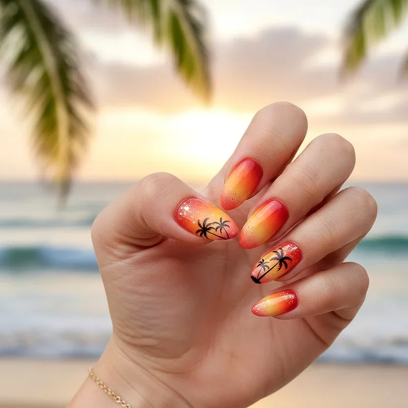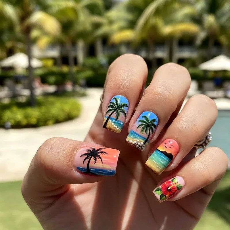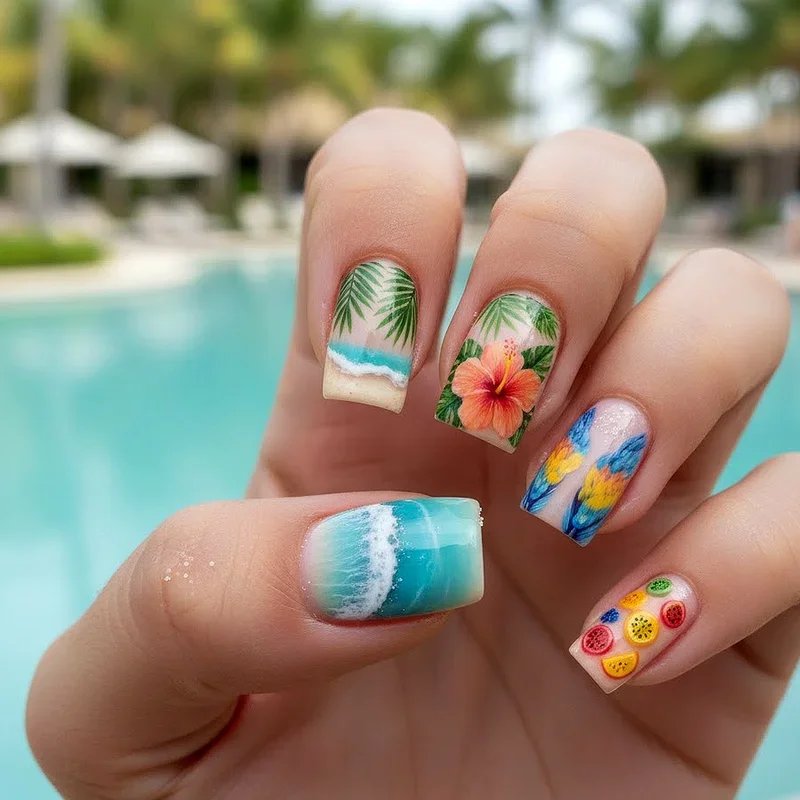 Transform your summer style with vibrant tropical nail designs featuring palm trees, ocean waves, exotic fruits, and paradise-inspired colors.