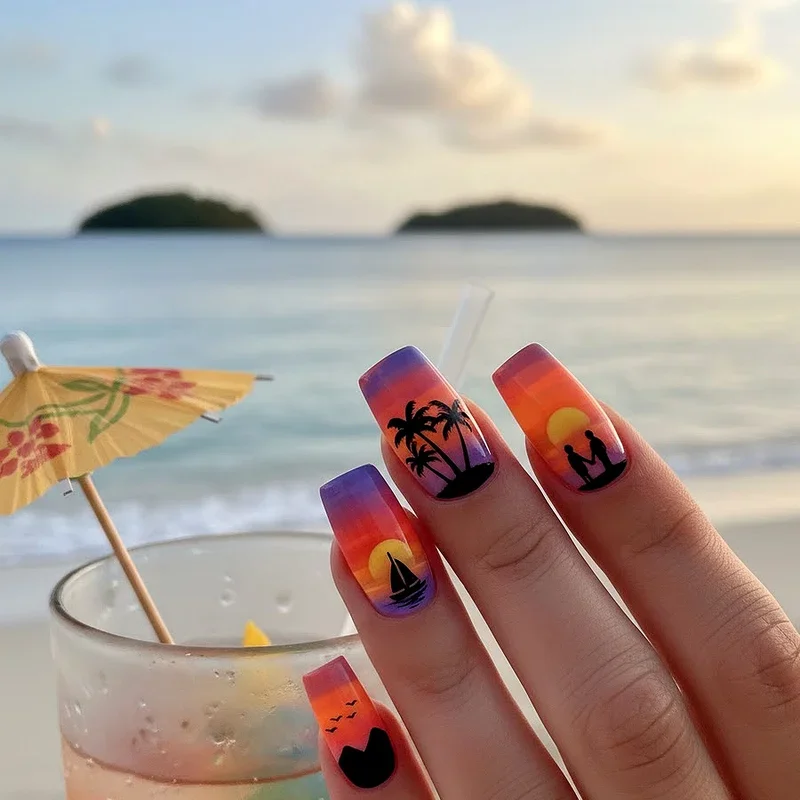 Combine dramatic sunset colors with striking black silhouettes to create stunning contrast that captures golden hour magic. Paint gradient backgrounds transitioning from warm yellows through oranges to deep purples, then add black silhouettes of palm trees, boats, or beach scenes. This design technique creates depth and drama while remaining relatively simple to execute for nail artists of all skill levels. The silhouettes stand out boldly against colorful backgrounds, ensuring your nail art makes strong visual impact from any distance. You can vary the silhouette scenes across different nails, telling a story of island life from sunrise to moonlit nights. This romantic design suits both casual and dressy occasions, adapting beautifully to different settings and styling needs. The sunset silhouette captures that perfect moment when day surrenders to night, painting the sky in colors that take our breath away.