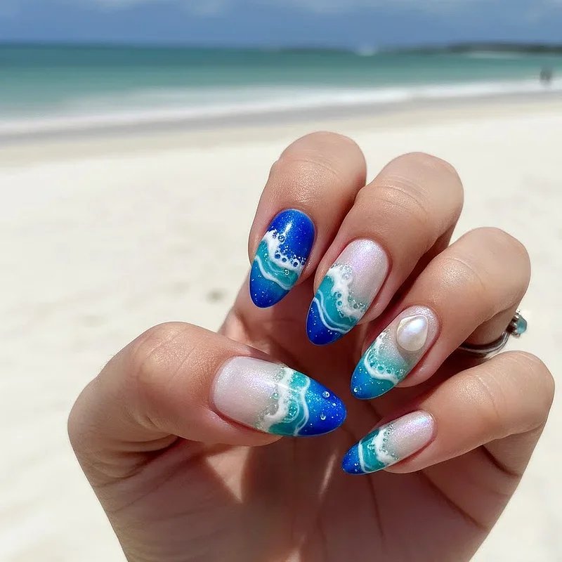 Nothing soothes the soul quite like watching gentle waves roll onto shore, and this design captures that tranquil essence perfectly. Create mesmerizing ocean waves using various shades of blue, from deep navy to crystal clear turquoise, blended together with white foam accents. The technique involves using a thin brush to create curved lines that mimic natural wave patterns and movement. You can add tiny details like gold flecks to represent sunlight dancing on water or white dots for sea spray. This design works beautifully on almond or coffin shaped nails, where the length allows for more detailed artistry. The calming blue tones complement virtually any summer outfit while evoking memories of seaside adventures. Consider adding a sandy beige accent nail to represent the beach where water meets land, creating a complete coastal scene across your fingertips.