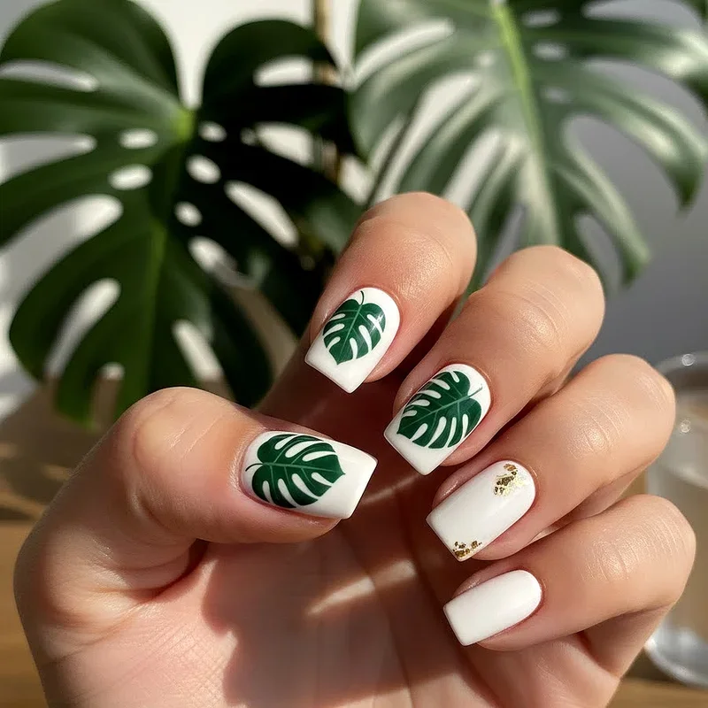For those who prefer subtle sophistication, monstera leaf designs offer tropical vibes with modern minimalist aesthetics. These distinctive split leaves feature clean lines and geometric shapes that translate beautifully into nail art without overwhelming the canvas. Paint simple black or green monstera outlines on white, nude, or pastel backgrounds for an understated yet stylish look. The beauty of this design lies in its versatility, working equally well in professional settings and casual weekend activities. You can paint full leaves on accent nails or create small leaf stamps scattered across all nails for varied effects. This botanical approach feels fresh and contemporary while still embracing tropical themes that celebrate nature's artistic designs. The monstera's unique perforated leaves create interesting negative space that adds depth and dimension to your manicure without requiring excessive detail or artistic skill.