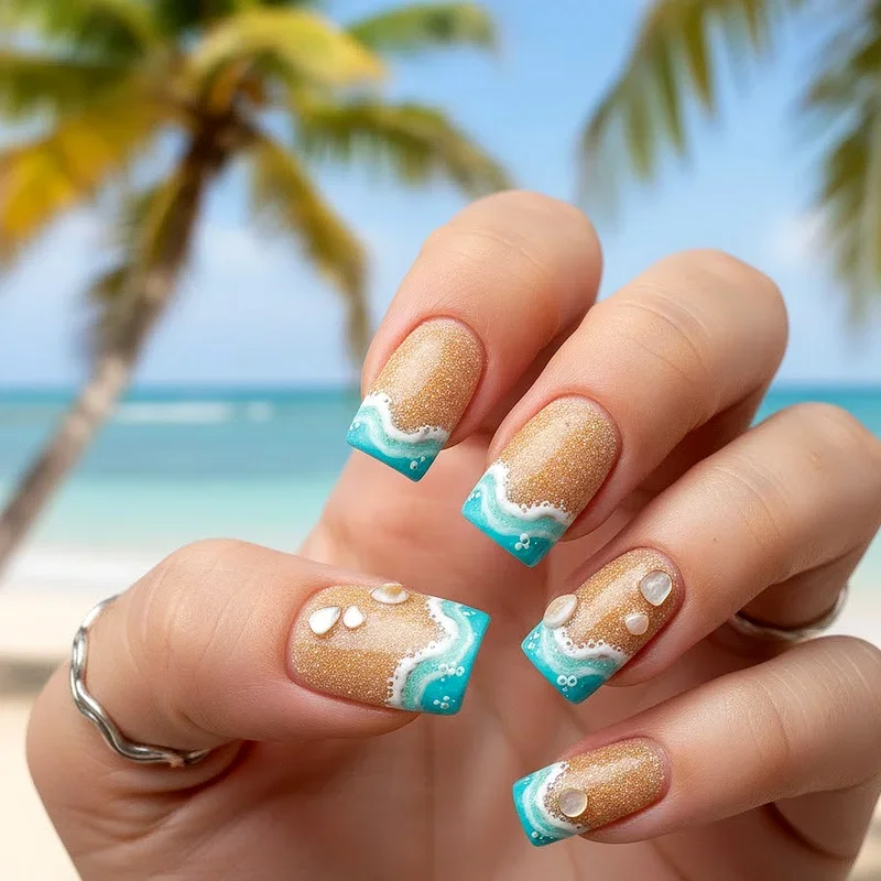 Bring the tactile experience of beach sand to your fingertips with textured nail designs that mimic grainy shorelines. This unique approach uses special textured polishes or fine glitter to create a sandy surface that catches light beautifully. Layer sandy beige or gold textured polish over a base color, then add small shell decals or starfish accents for enhanced beachy appeal. The texture adds dimensional interest that standard smooth polish cannot achieve, making your manicure truly stand out from typical designs. You can create full textured nails or use the sandy texture as accent elements combined with smooth ocean blue nails. This design feels playful and unexpected while staying true to tropical beach themes that define summer aesthetics. The sandy texture reminds us of barefoot walks along the shore and the simple pleasure of feeling warm sand between our toes.