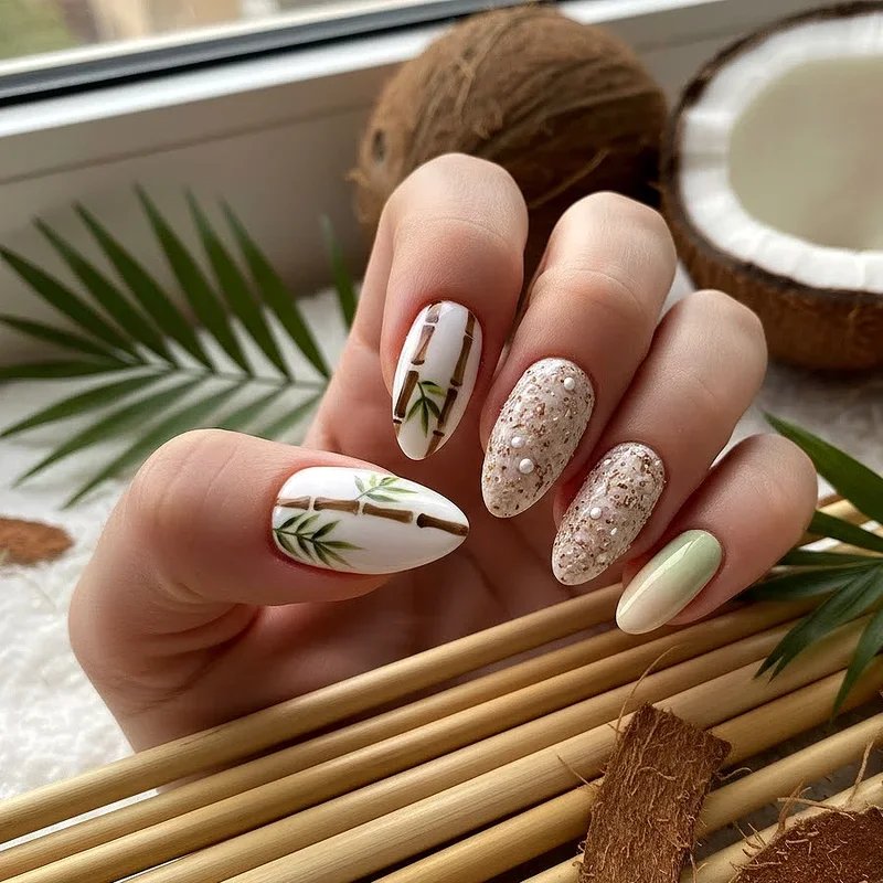 Embrace natural tropical textures through coconut and bamboo inspired nail designs that celebrate organic island materials. Paint coconut halves showing white flesh against brown shells, or create bamboo segments with characteristic rings and nodes for earthy appeal. These designs incorporate brown, tan, and cream tones that provide welcome contrast to typically bright tropical color palettes. The natural elements feel grounded and sophisticated while maintaining clear tropical connections through their distinctive island origins. You can combine coconut and bamboo elements with green leaf accents or ocean blue backgrounds for cohesive tropical themes. This design appeals to those who appreciate natural aesthetics and prefer earthier tones over bold neon brights. The organic textures remind us that tropical beauty exists in subtle natural details, not just flashy colors and dramatic contrasts.