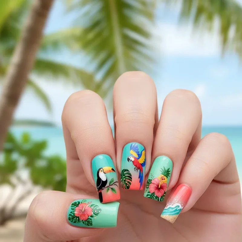 Tropical birds bring vibrant color and exotic flair to nail designs through their spectacular plumage and distinctive features. Toucans with their oversized colorful beaks make particularly striking accent nails that capture attention and admiration. Paint these charismatic birds on bright backgrounds that complement their natural rainbow coloring, using fine brushes for detailed feather work. Parrots offer equally stunning options with their emerald greens, sapphire blues, and ruby reds creating eye catching focal points. You can paint realistic bird portraits or opt for simplified cartoon versions depending on your artistic confidence and desired style. These avian designs work wonderfully for bird lovers and anyone seeking unique tropical nail art that goes beyond typical beach themes. The birds symbolize freedom and exotic adventure, perfect sentiments for summer when we crave escape and new experiences.