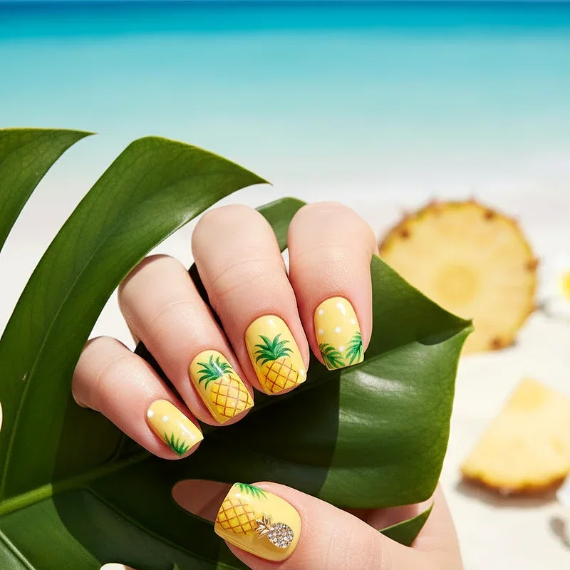 The pineapple stands as the ultimate symbol of tropical hospitality and summer sweetness, making it perfect for cheerful nail designs. You can create adorable pineapple accents on one or two nails while keeping others in complementary solid colors like yellow or green. Paint the pineapple body in golden yellow, add crisscross brown lines for texture, and top with bright green leaves for authenticity. This playful design radiates positive energy and works wonderfully for summer parties, beach weddings, or tropical themed events. Consider alternating pineapple nails with solid pastel backgrounds to avoid overwhelming the overall look with too much detail. The fruit's distinctive shape makes it instantly recognizable even in miniature form. This design proves that sometimes the sweetest style statements come from embracing fun, whimsical elements that make you smile every time you glance at your hands.