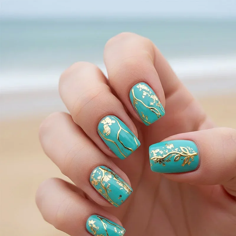 The pairing of turquoise and gold creates luxurious combinations reminiscent of ancient Egyptian jewelry and Mediterranean opulence. These complementary colors enhance each other beautifully, with warm gold tones making cool turquoise appear more vibrant. You can incorporate gold through foil accents, metallic polish stripes, glitter overlays, or delicate hand-painted details adding richness. This combination works exceptionally well for special occasions like weddings, parties, and celebrations where nails should shine. Consider alternating turquoise and gold nails for bold statements or use gold as accent details. Gold leaf pieces pressed into wet polish create texture catching light from every angle. The regal quality elevates any manicure from ordinary to extraordinary effortlessly.