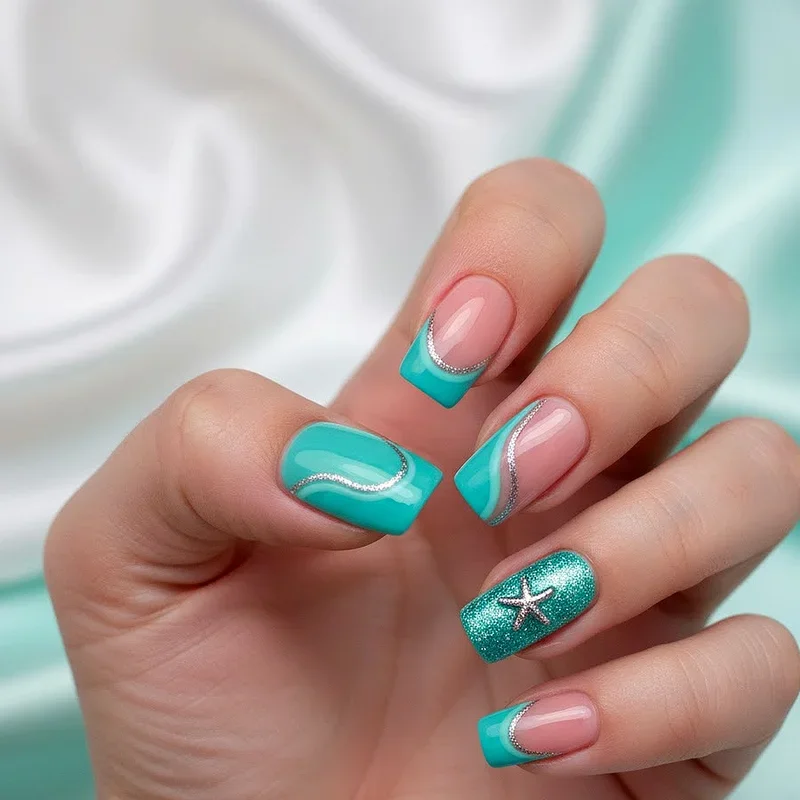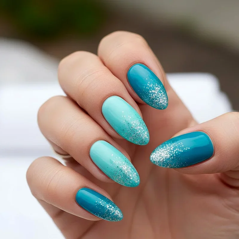 Combining gradient techniques with glitter creates multi-dimensional art where turquoise transitions into sparkling silver for maximum visual impact. This design merges two popular trends into one cohesive look feeling both elegant and celebratory simultaneously. Start with solid turquoise at bases and gradually fade into silver glitter toward tips for mermaid-inspired effects. The metallic coolness of silver complements turquoise beautifully while adding texture and light-catching properties enhancing overall designs. You can adjust gradient ratios, making it more turquoise-heavy or silver-dominant depending on personal preference. This combination works spectacularly for holiday parties, New Year celebrations, and any event where sparkle feels appropriate. The gradient technique softens transitions between solid color and glitter preventing harsh lines.