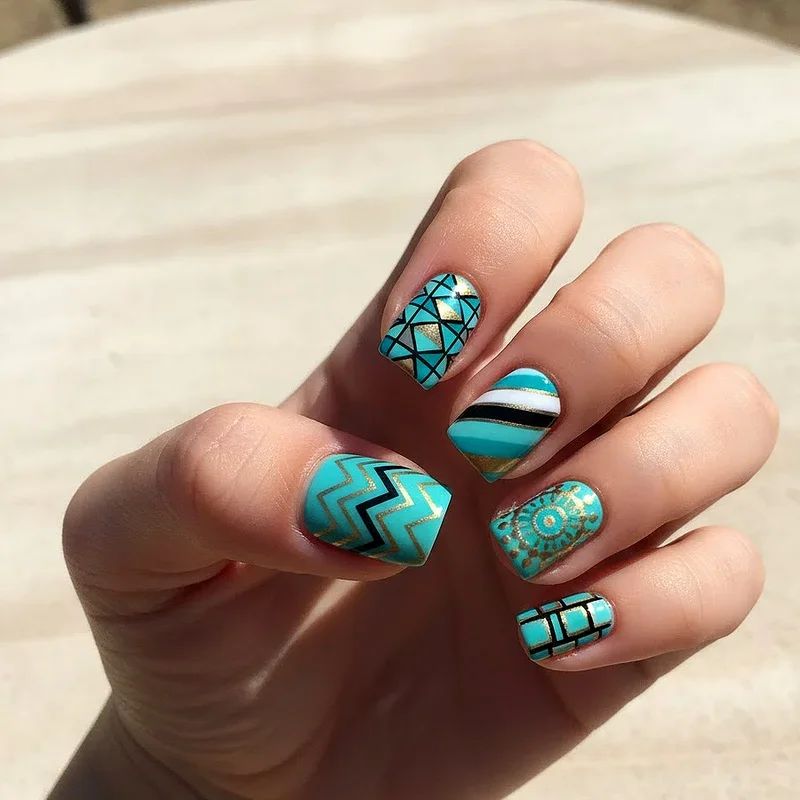 Geometric designs bring structure and modern aesthetics through clean lines, shapes, and symmetrical patterns creating visual interest. Triangles, squares, stripes, and chevrons arranged in turquoise and contrasting colors produce striking contemporary art. This style appeals to those appreciating minimalist design principles while wanting nails making clear statements. You can create geometric patterns using nail tape for precise lines or freehand for organic interpretations. Negative space techniques work beautifully, allowing natural nails becoming part of overall patterns. Color blocking with turquoise alongside neutrals or metallics produces bold fashion-forward looks feeling editorial. These designs prove turquoise adapts to various style preferences from bohemian to ultra-modern successfully.