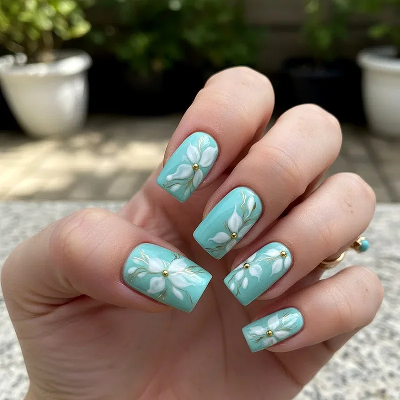 9. Turquoise Floral Nail Art