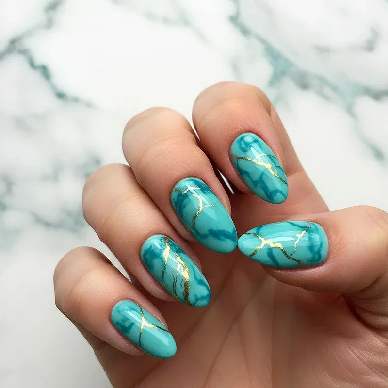 5. Turquoise Marble Effect Nails