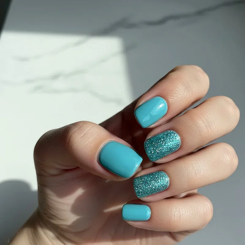4. Glittery Turquoise Accent Nails